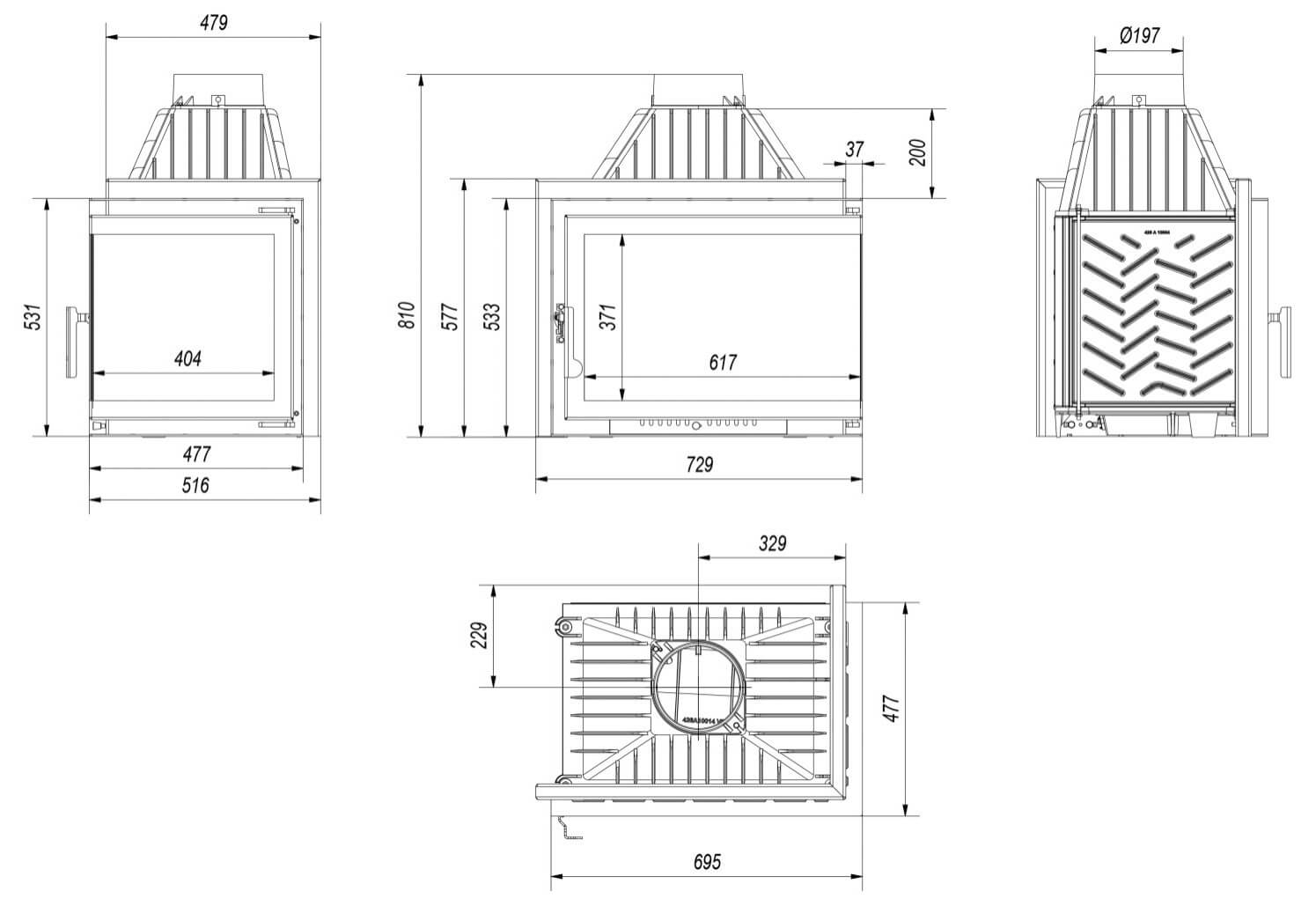- Focarul are o eficienta crescuta datorata lamelelor radiante de pe peretii exteriori ai acestuia. Acesta face parte din gama semineelor cu sticla pe lateral fara stalp, ce ofera acestuia un aspect modern, fiind o varianta foarte des aleasa pentru locuinte tip open-space. Acest focar are un consum scazut de lemne, avand un timp de ardere a lemnului la o umplere a focarului de 4-5 ore, cu ventilatia focarului la nivel mediu.